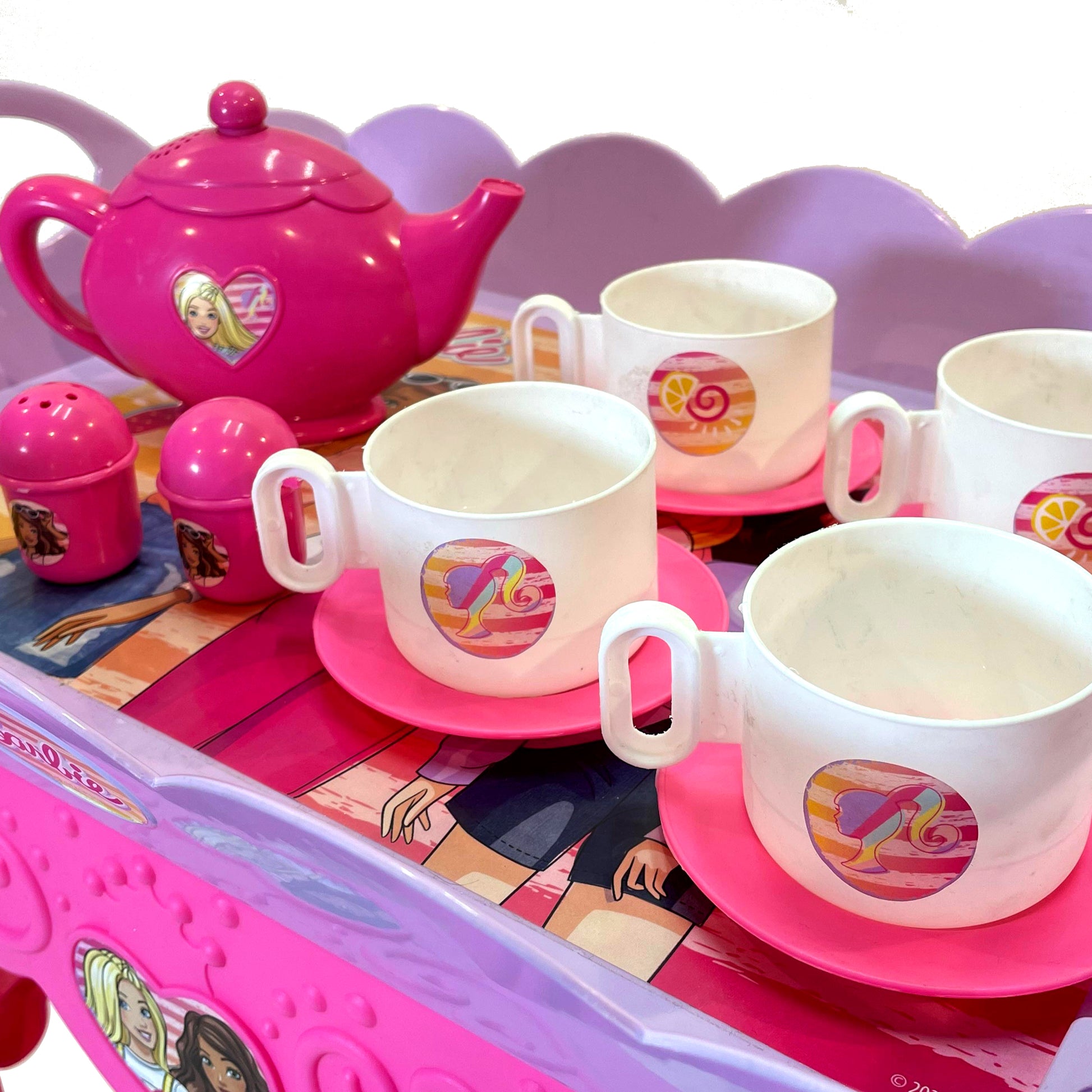 Kriiddaank TeaTrolleySet-BarbieThemeByMattelBarbie Tea Trolley SetBarbie Theme Tea Cart PlaysetBarbie Pretend Play Tea SetBarbie-themed tea cart with cups & accessoriesPortable Barbie tea trolley toy for pretend play